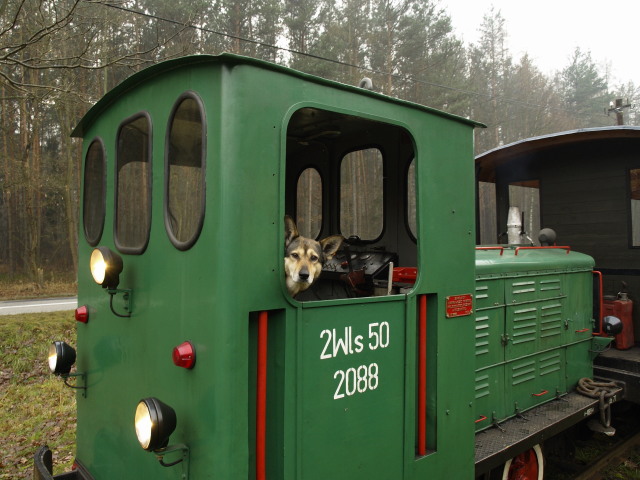 Jeden z psów, który bieg³ za poci±giem w kabinie lokomotywy po przyje¼dzie do Paproci.