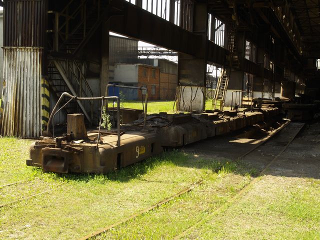 Kolejne dwuosiowe wagony stoj±ce w nieczynnej hali z innymi wagonami.