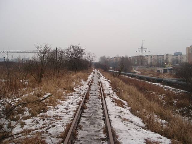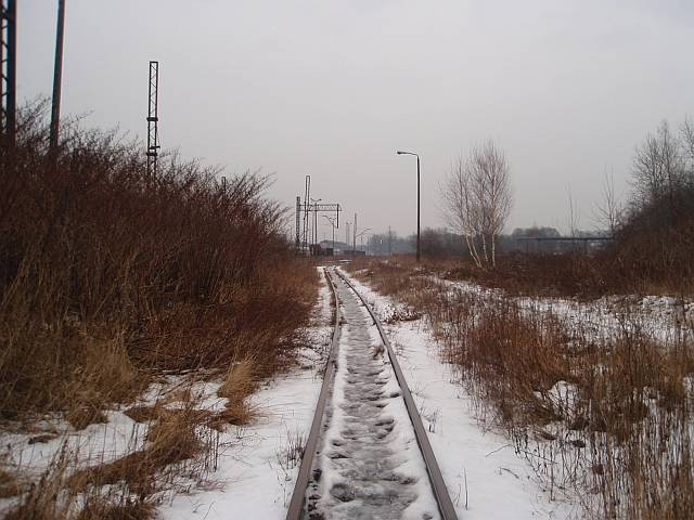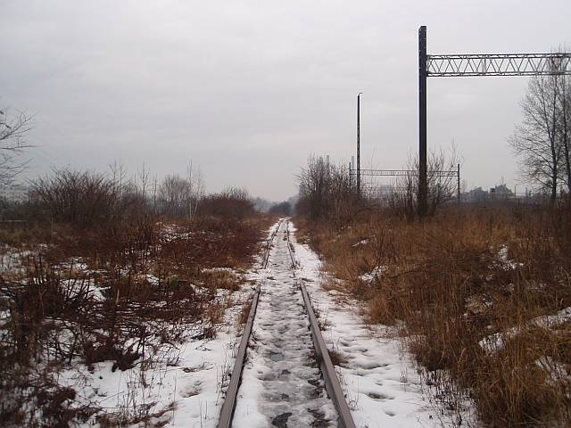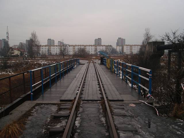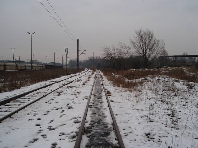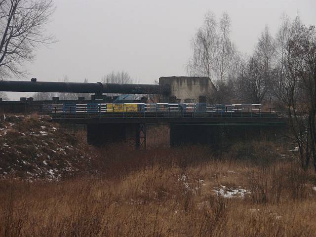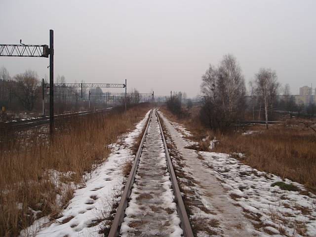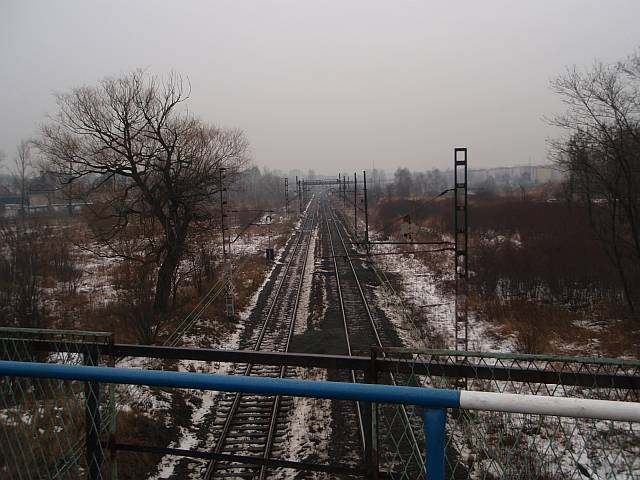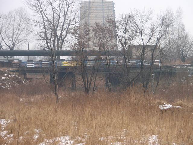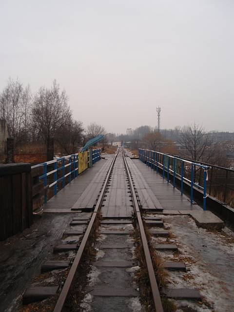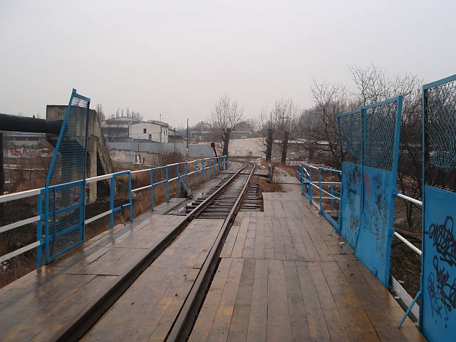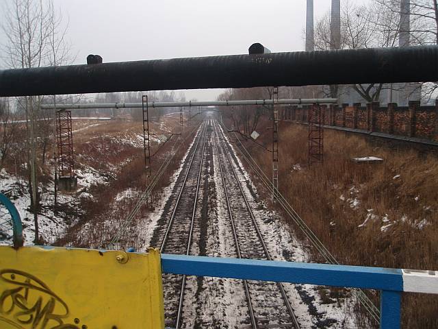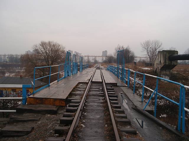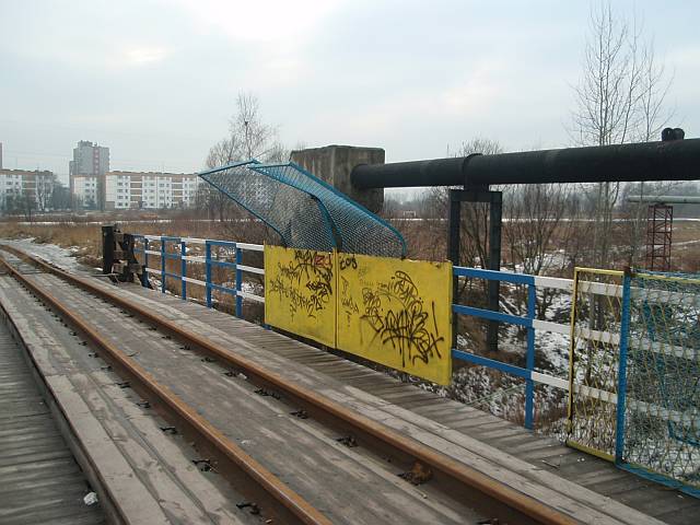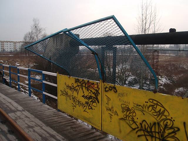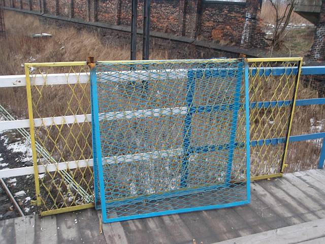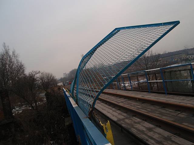 Widok na wygięte elementy ochronne na moście nad linią normalnotorową do Gliwic.