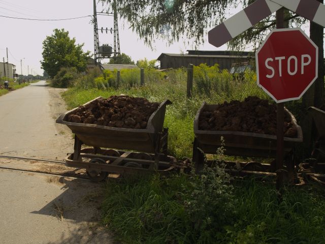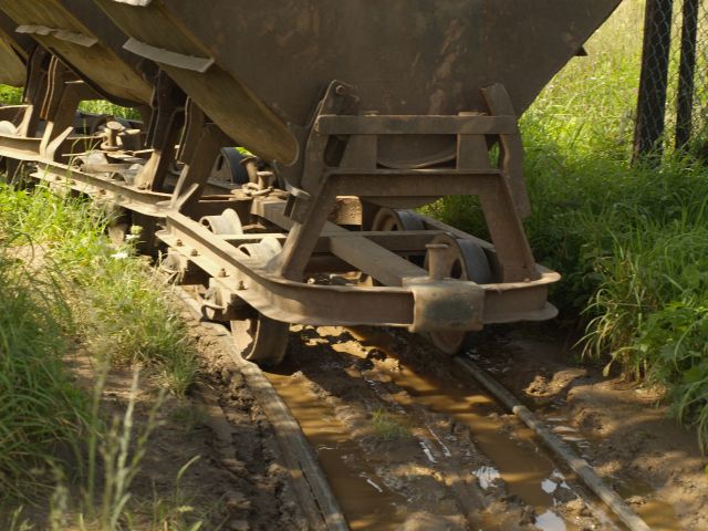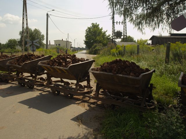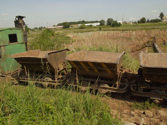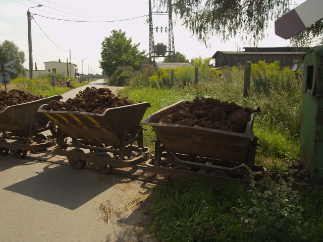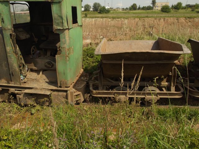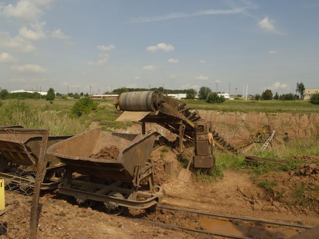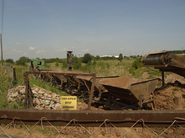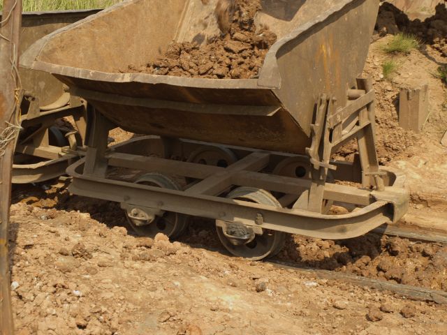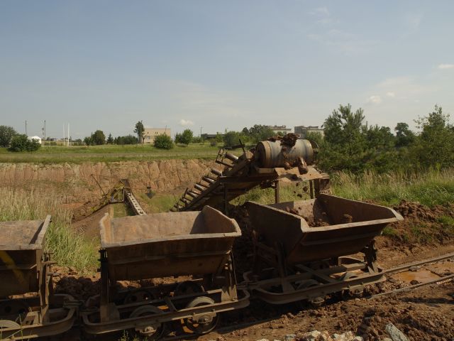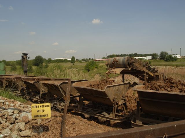 Podciąganie składu do taśmociągu, którym glina jest transportowana z dna wyrobiska prosto do koleb.