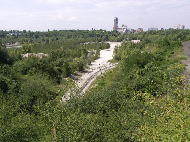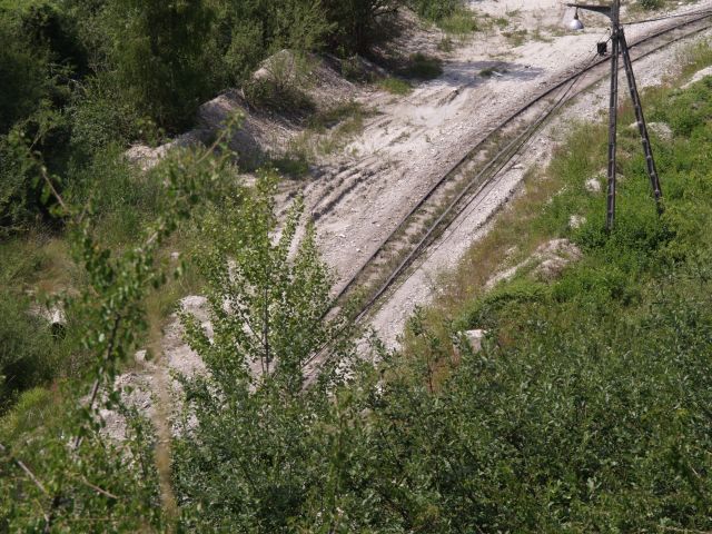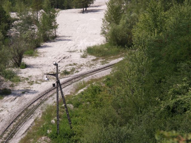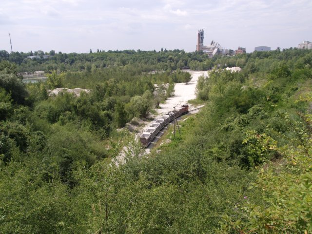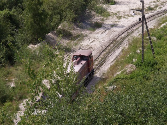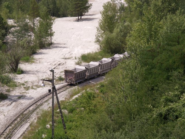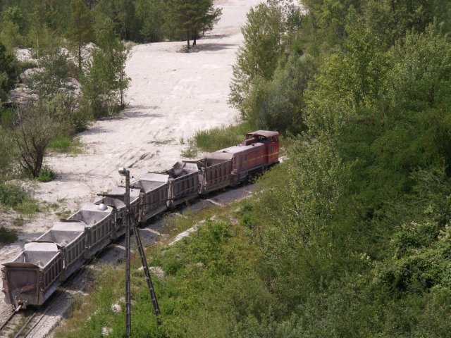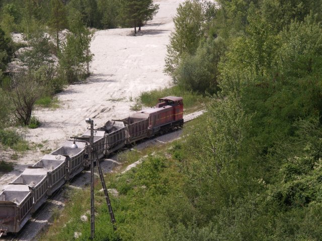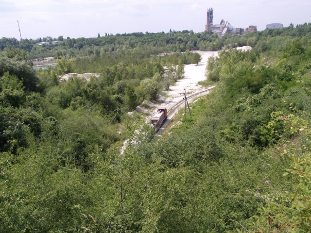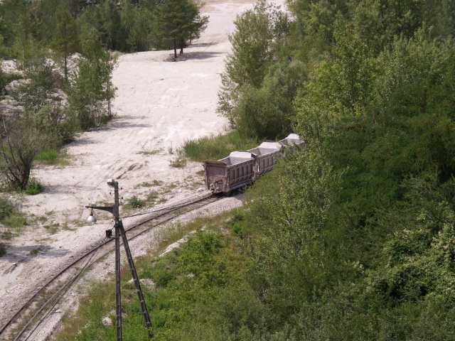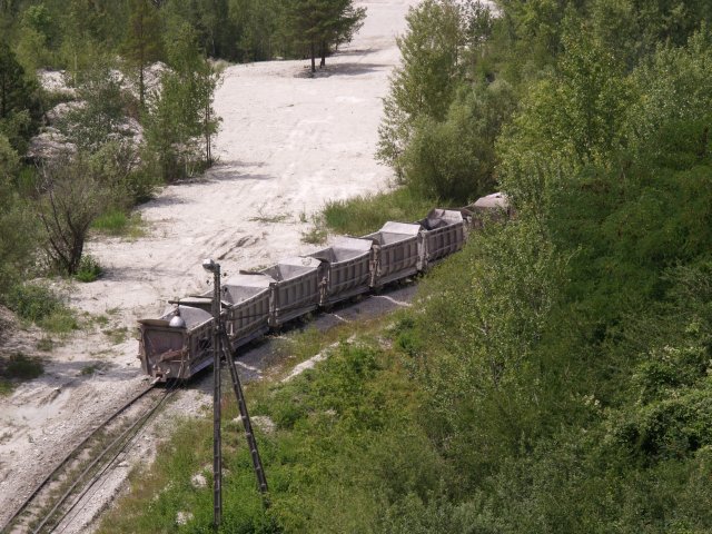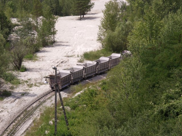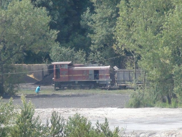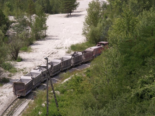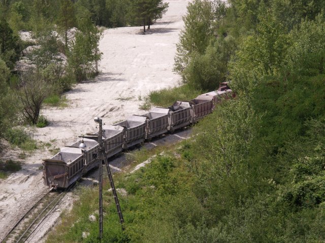Skład złożony z 7 wagonów pchany przez Lyd2 na wyrobisko.