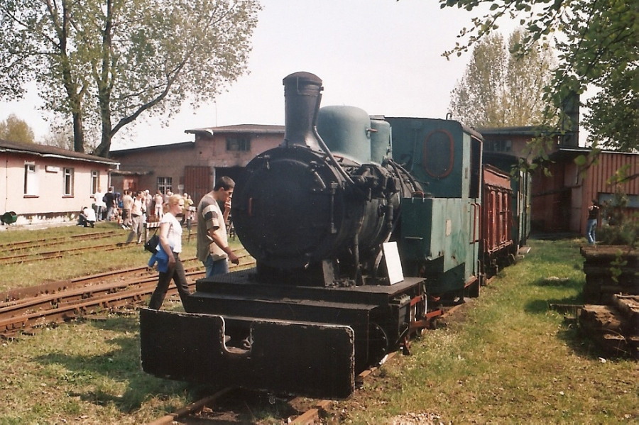 Las27 stojący z dwoma wagonami przed lokomotywownią.