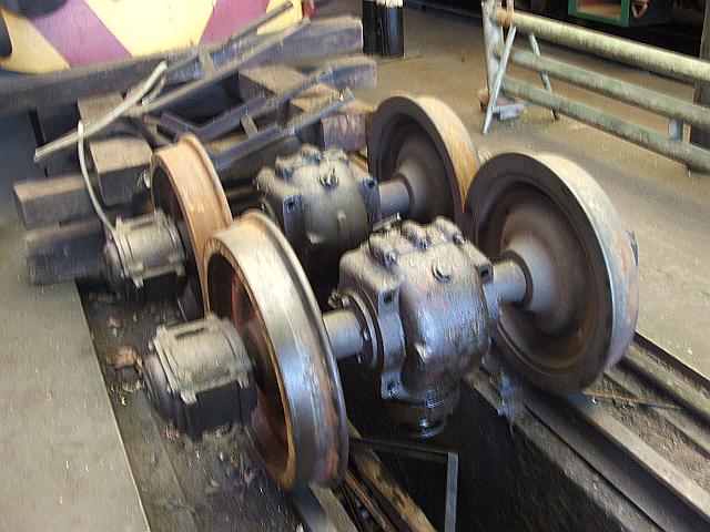 Wymontowane zestawy kołowe z powyższego wagonu motorowego.