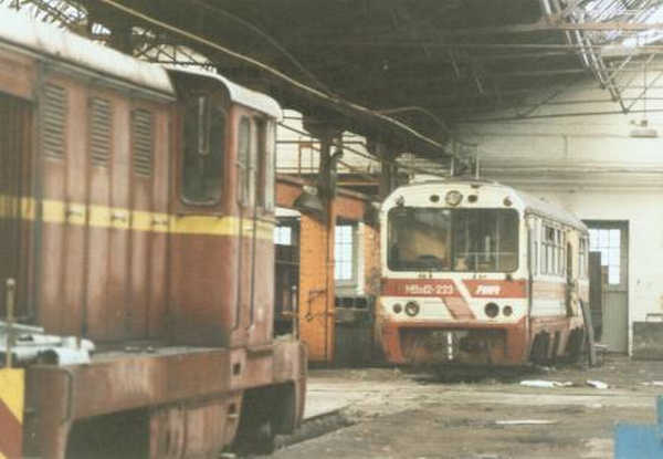 Wagon motorowy MBxd2-223 w hali warsztatów naprawczych w Bytomiu Rozbarku. Na pierwszym planie Lxd2.