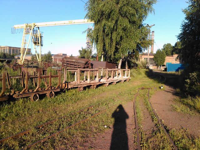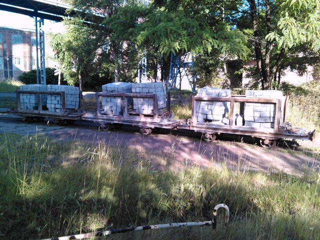 Kolejne załadowane platformy do przewozu ciężkich materiałów.