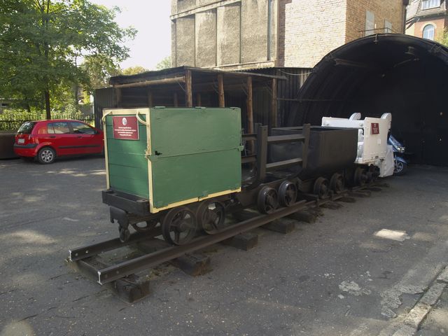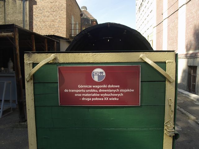 Wozy dołowe i ładowarka na placu za budynkiem muzeum.