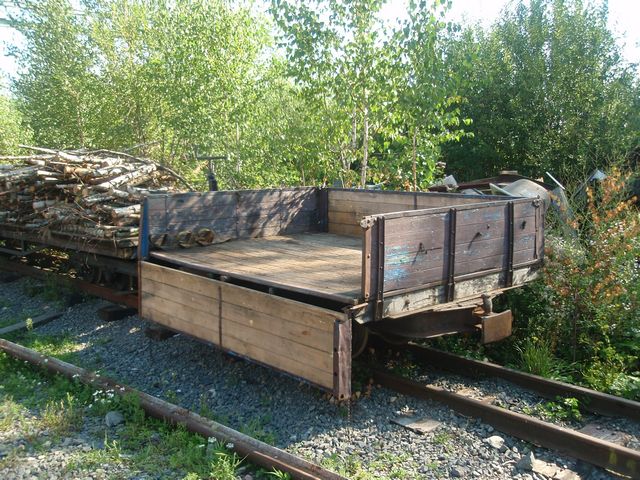 Dwuosiowa węglarka niskościenna, czteroosiowa platforma, mała dwuosiowa cysterna i mała platforma z agregatem prądotwórczym (lub kompresorem).