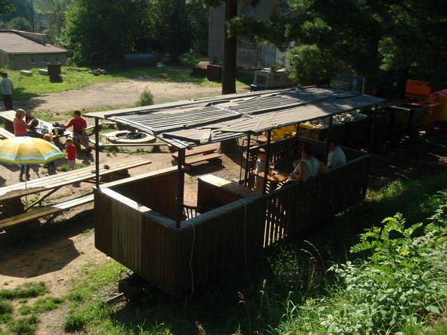 Widok z góry na wagon z ³awkami i stolikiem.