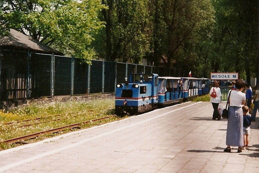 Lokomotywa WLp50 z poci±giem turystycznym wjeżdża na stację Wesołe Miasteczko.