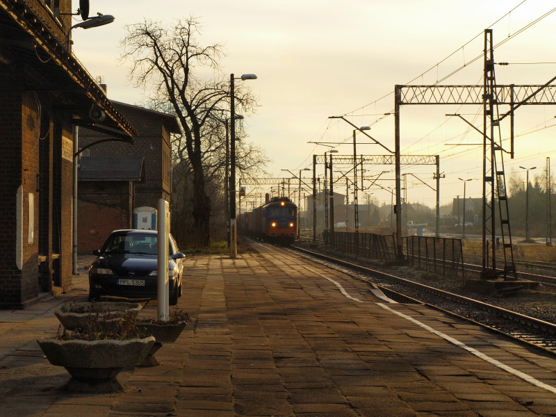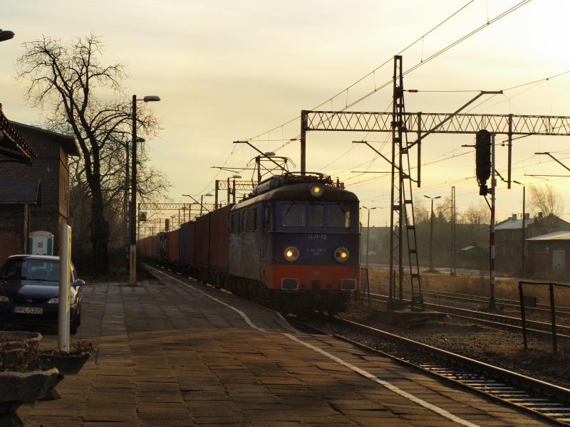 3E/1-52 przejeżdżający przez normalnotorową stację Pleszew z pociągiem kontenerowym.