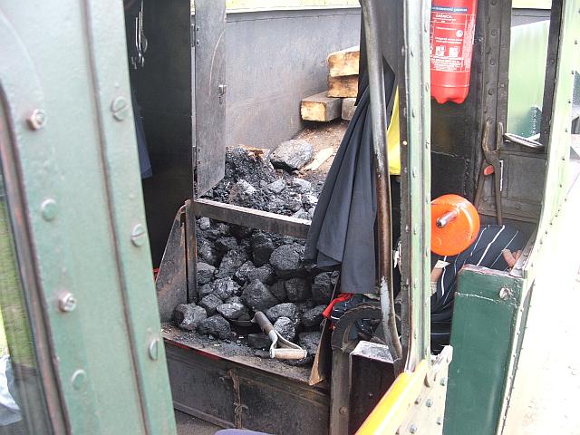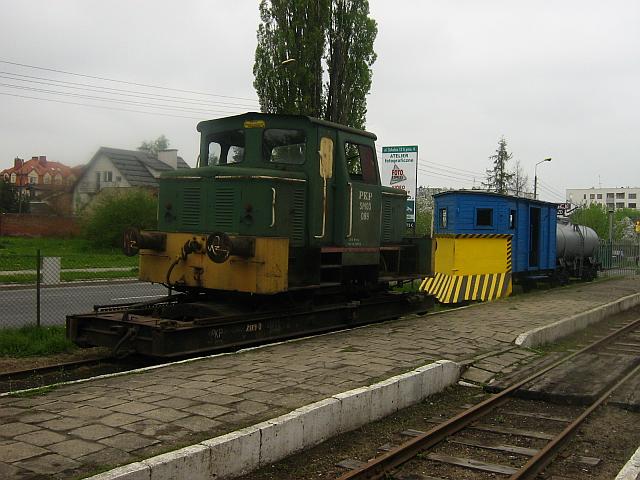Normalnotorowa lokomotywa SM03-089 stojąca na transporterze.