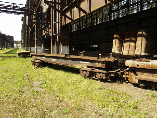 Kolejne dwuosiowe wagony stoj±ce w nieczynnej hali z innymi wagonami.