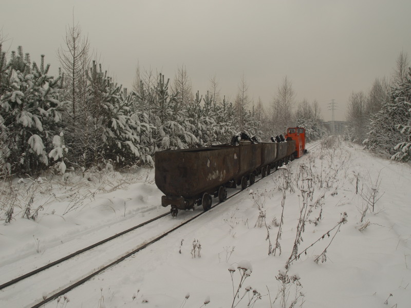 Skład 6 wozów do urobku ci±gnięty przez WLp85-3, który dodatkowo pcha pług.
