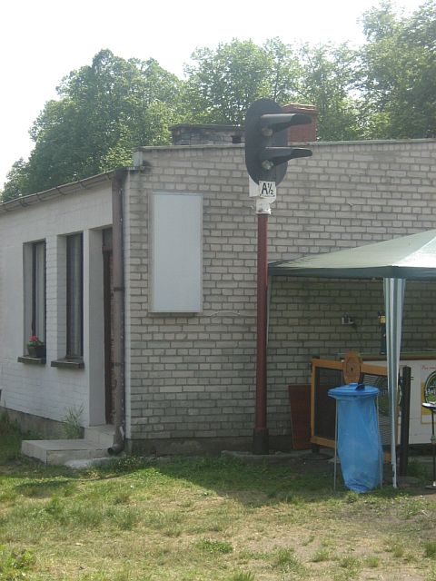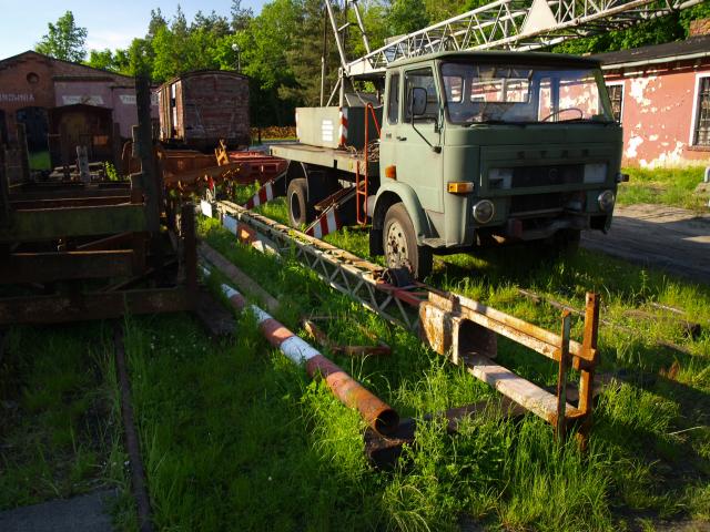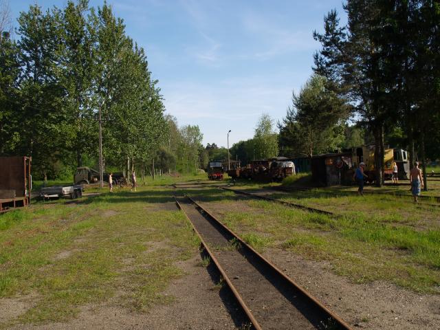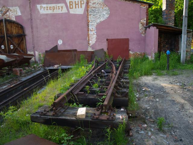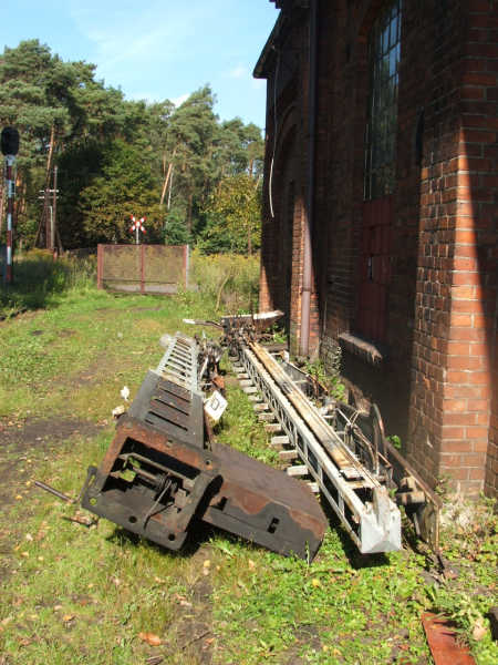 Semafory przywiezione z normalnotorowej stacji Rybnik Gotartowice leżące obok budynku kuźni.