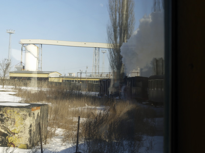 Widok z wagonu na skład na łuku podczas wyjazdu ze stacji ¦roda Wlkp. W±sk.