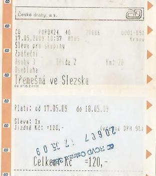 Bilet na 3 osoby tam i powrót kupiony u konduktora w roku 2009.