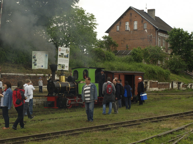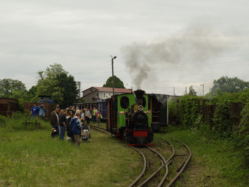 Orenstein & Koppel zabierający dwuosiowy wagon kryty przed wyruszeniem do Wysokiej.