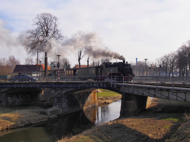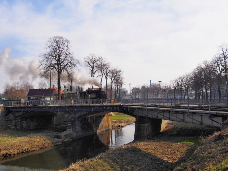 Pociąg nr 204 przejeżdżający przez przejazd na Südstraße, który znajduje się na moście nad rzeką Mandau